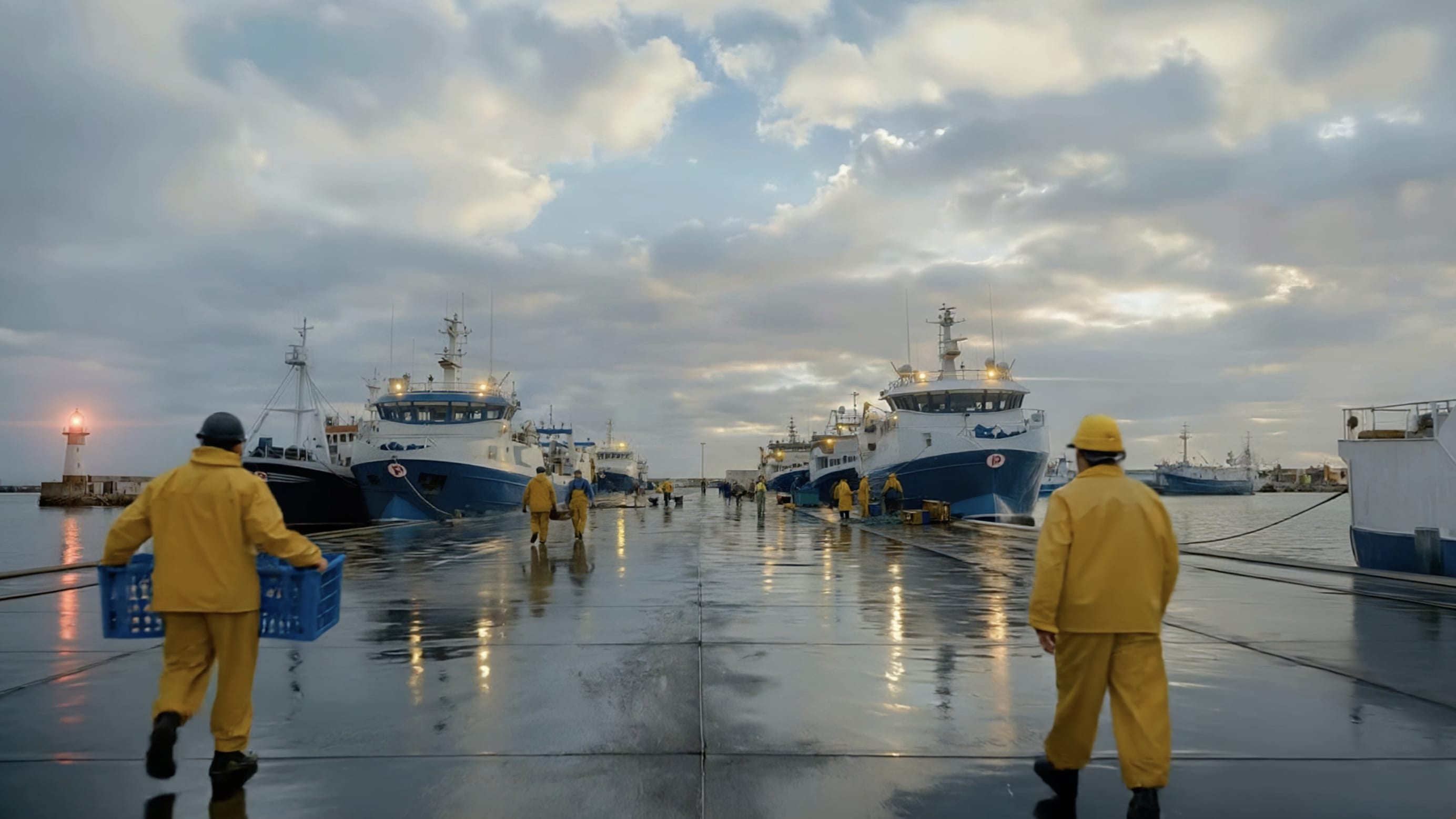 • El puerto idílico (y virtual): Generamos fondos con IA que recreaban exactamente la flota real de Pescanova amarrada en un puerto. No era una imagen estática; le dimos vida. Pescadores moviéndose, el agua, los barcos... Todo respiraba realidad. Sobre ese plano generado, incrustamos en croma a nuestro actor real para introducir el spot.